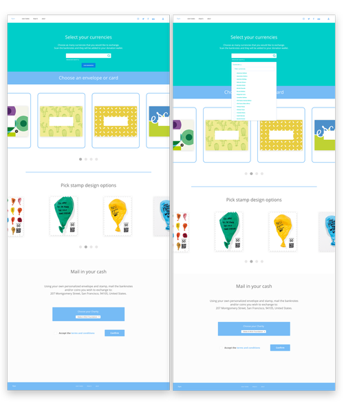 In order to test the whole concept and prototype I had to not only test the online interaction but also the process of sending the money after receiving the stationery in the mail. For timing purposes the test was conducted all in one day. While the real interaction would require a couple days/weeks. I asked an user to go on the website and complete the tasks of select their currencies and stationery. I then gave them an envelope and stamp that they could put cash and coins in and send in the mail. The envelope was pre-labeled and big enough to carry the money. After this I asked them about what they felt about the whole process. One of the many responses that I got from testing the prototype was that security was a main concern. It led me to add the option to scan the banknotes so that both party would be insured that it was a legitimate process.
